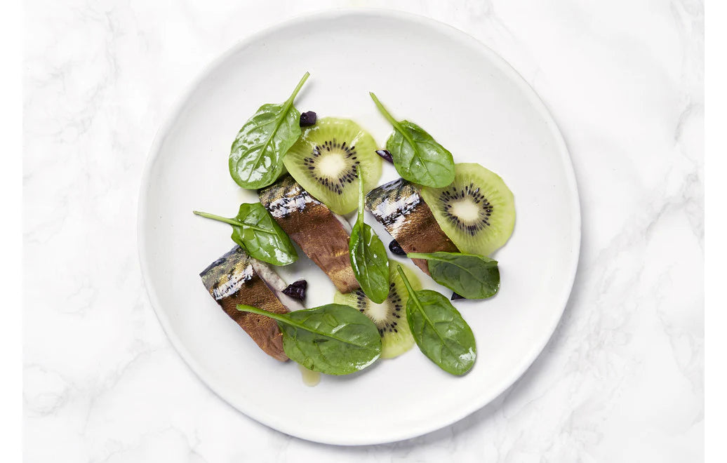Sustainably sourced mackerel, organic kiwi, Kalamata olive, and baby spinach salad