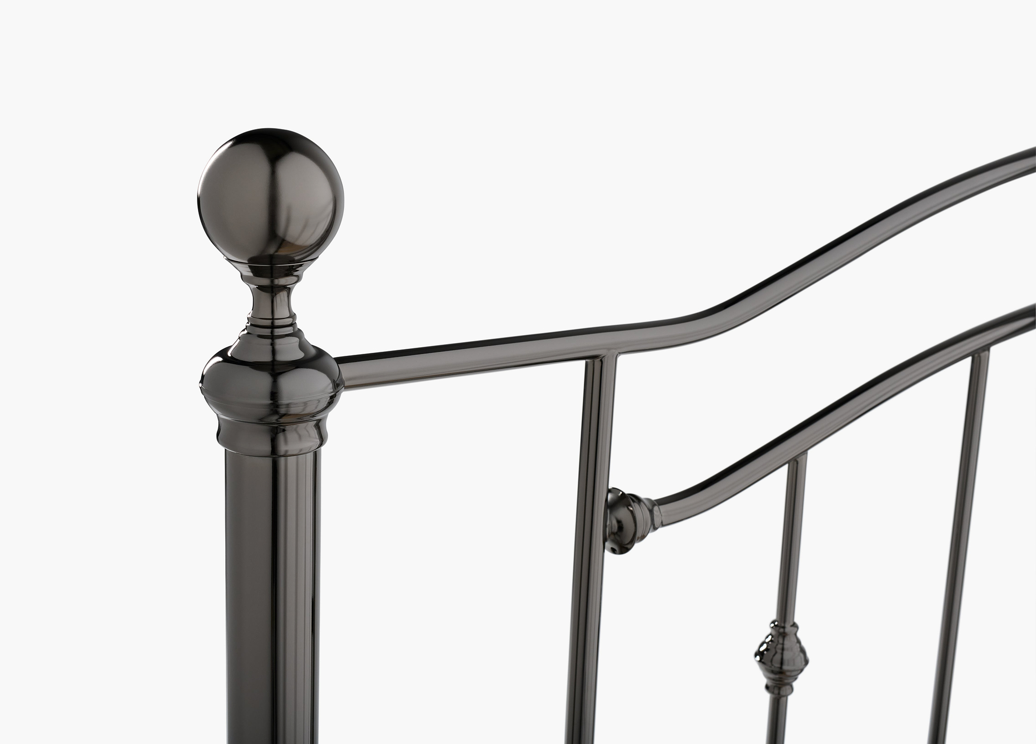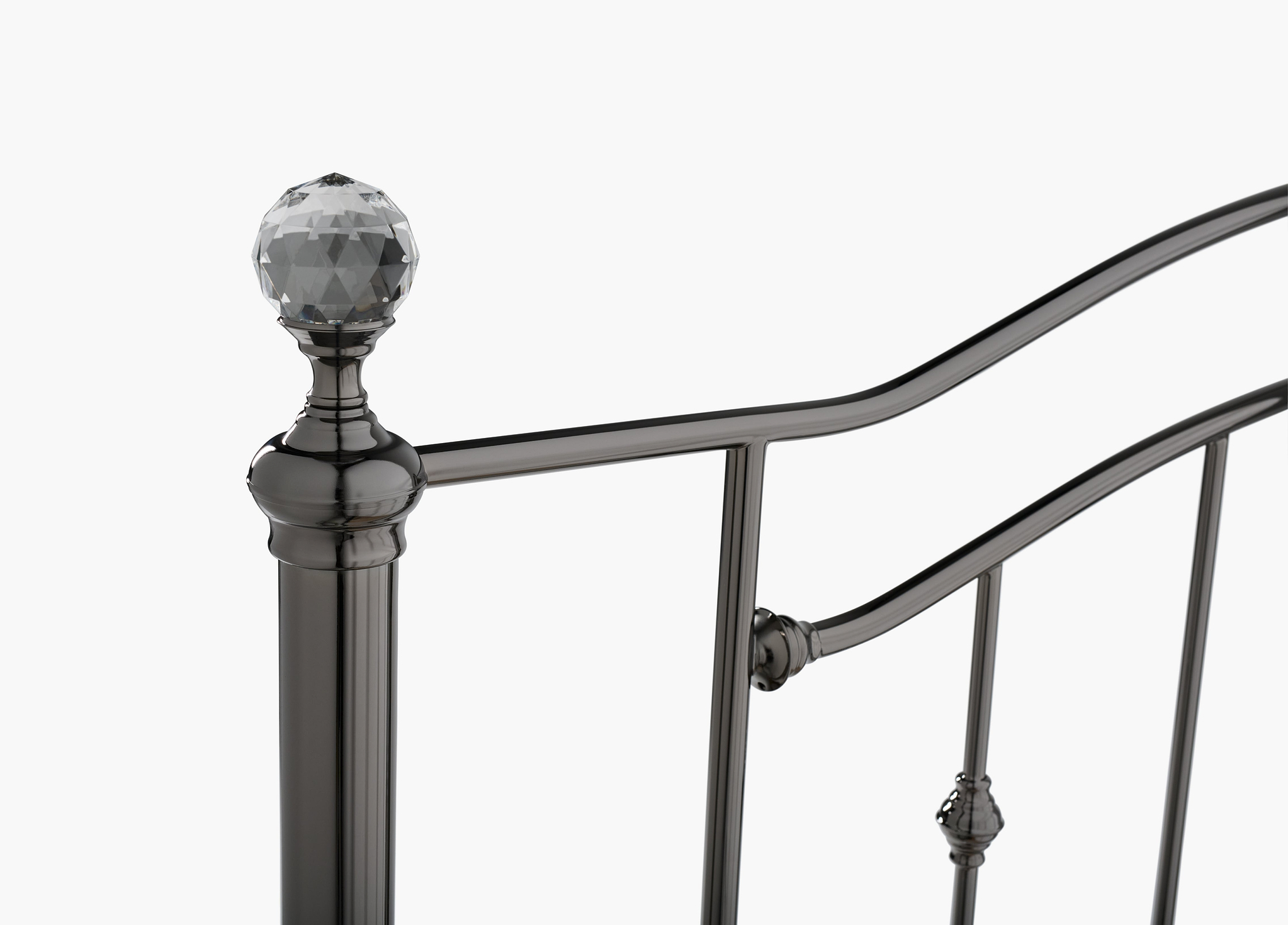 A modern take on ornate heritage styles, this luxe metal bed comes in a choice of two satin finishes.