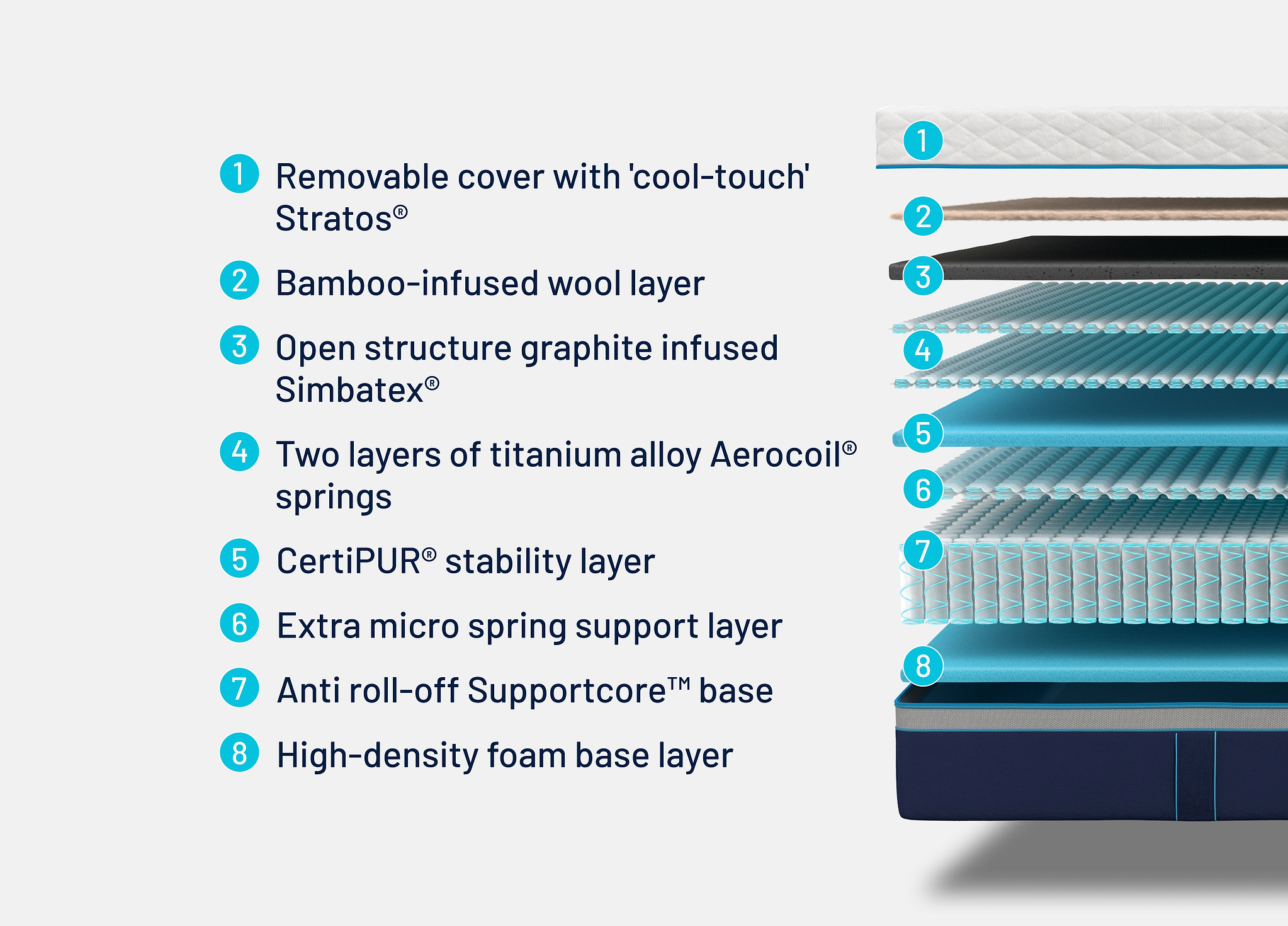 Too hot, you might be struggling to sleep well at night. So we invented Simbatex®, an innovative open structure foam that’s engineered to encourage airflow for a cooler sleep. And to give you an extra boost, it’s infused with graphite for heat dissipation.
